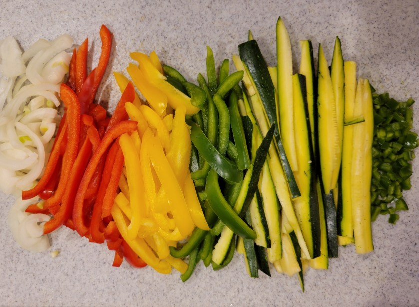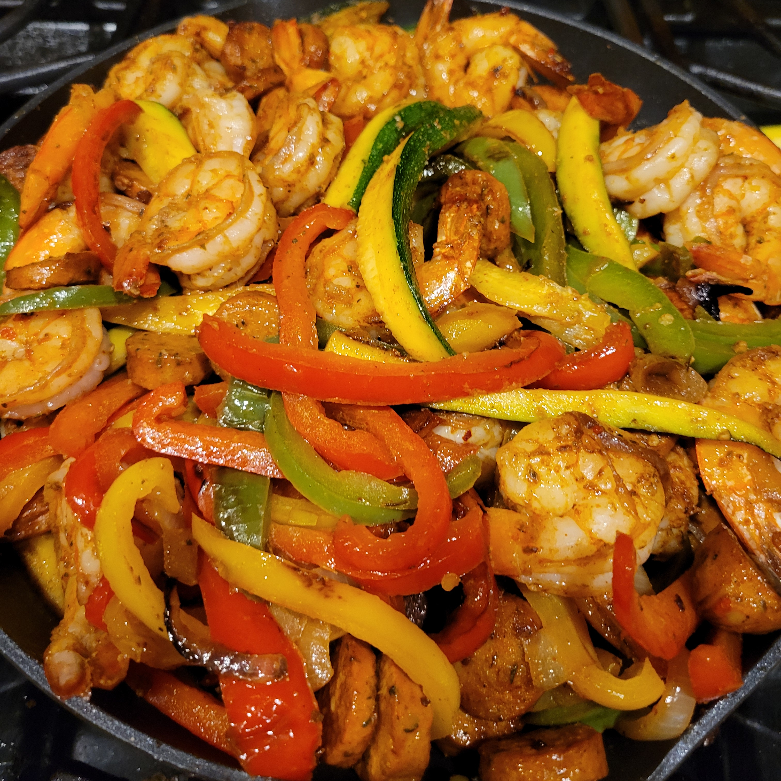 The fiber and water content from the zucchini, bell peppers, and onions make this dish so voluminous that you don’t miss having any starchy carbs. Although layering this dish over a half cup of Jasmine or brown rice, quinoa, or couscous would also be delicious. Paired with protein-dense shrimp and andouille sausage, you will leave the table with a happy belly! And I strongly recommend following Sarah’s advice to use raw, not pre-cooked shrimp…it makes a world of a difference.