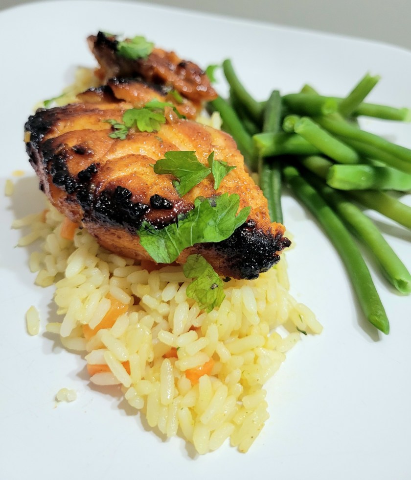 I paired this entrรฉe with Birds Eye Chicken Flavor Seasoned Rice and Vegetables side dish. Don’t let the chicken flavor fool you, trust me it pairs very well with the seasonings in the salmon. The rice dish includes carrots, broccoli, and onions. I also used their Steamfresh Whole Green Beans. Frozen vegetables often get a bad wrap, but they are actually packed full of nutrients in that they are flash-frozen at their peak; locking in nutrients such as vitamins, minerals, and fiber. This post is not sponsored by Birds Eye; I just really like how easy it is to throw one of their Steamfresh bags in the microwave and have delicious sides in less than five minutes.